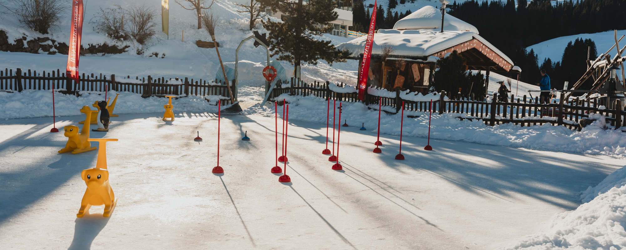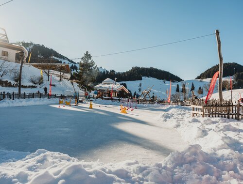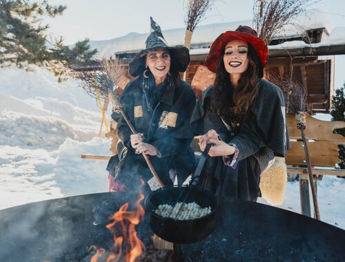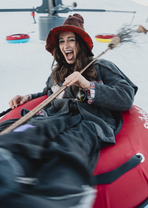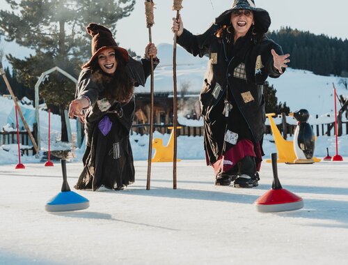 Dazu gehören ein Mini-Spaß-Förderband, Natureislaufplatz, Feuerstelle, Winterspielplatz zum Toben im Schnee und die Liegewiese. Im beheizten Lebkuchenhaus, gleich neben der Eisbahn, kann man sich kostenlos Geräte zum Rutschen und Spielen ausleihen. Wir Hexen sind auch immer vor Ort und laden unsere kleinen Besucher ein, am Lagerfeuer Geschichten zu hören oder Apfelspalten zu grillen.